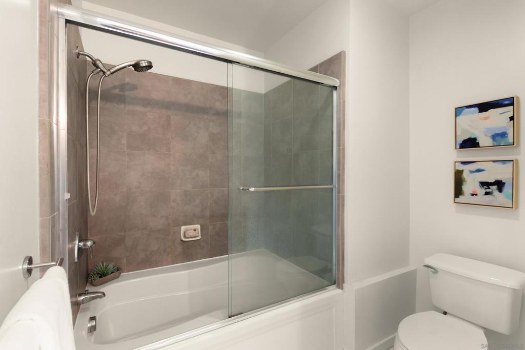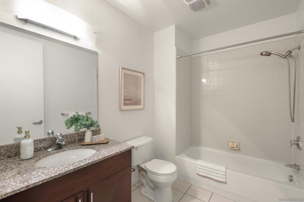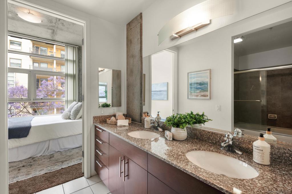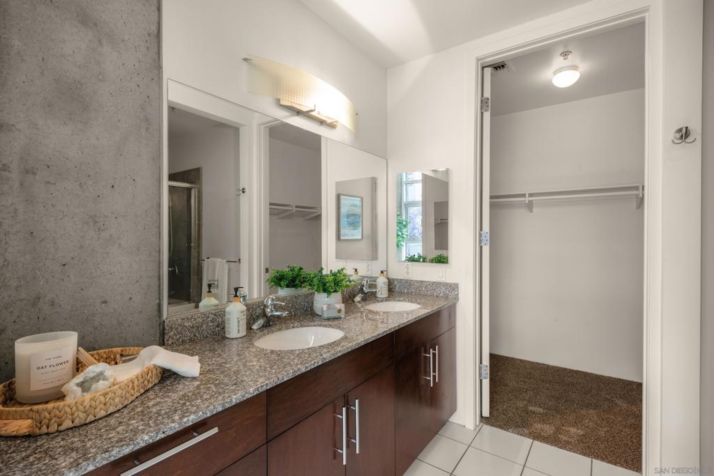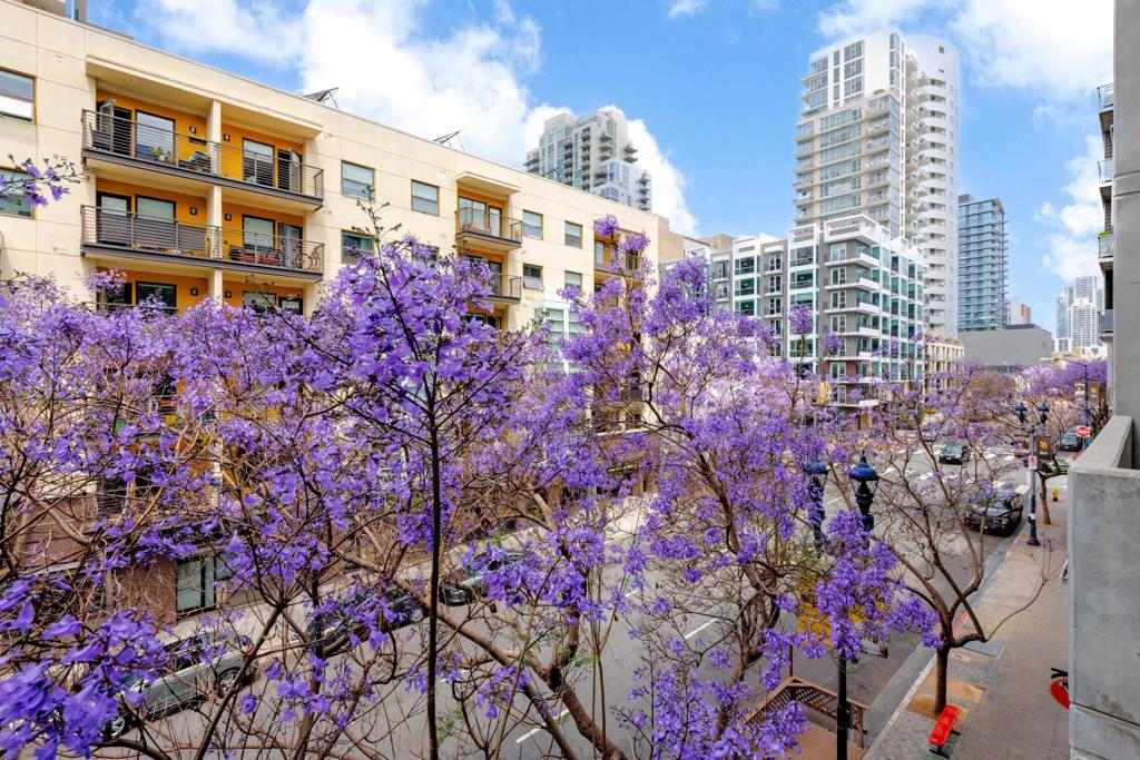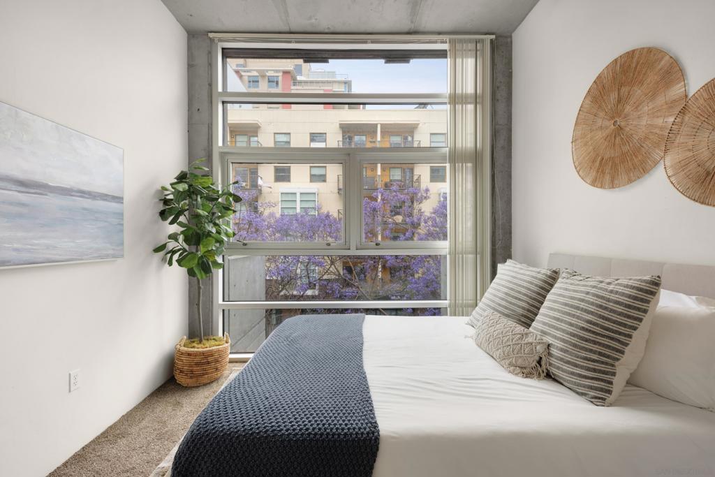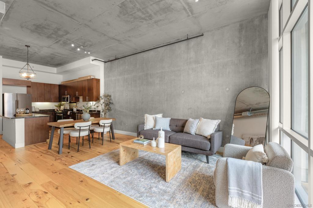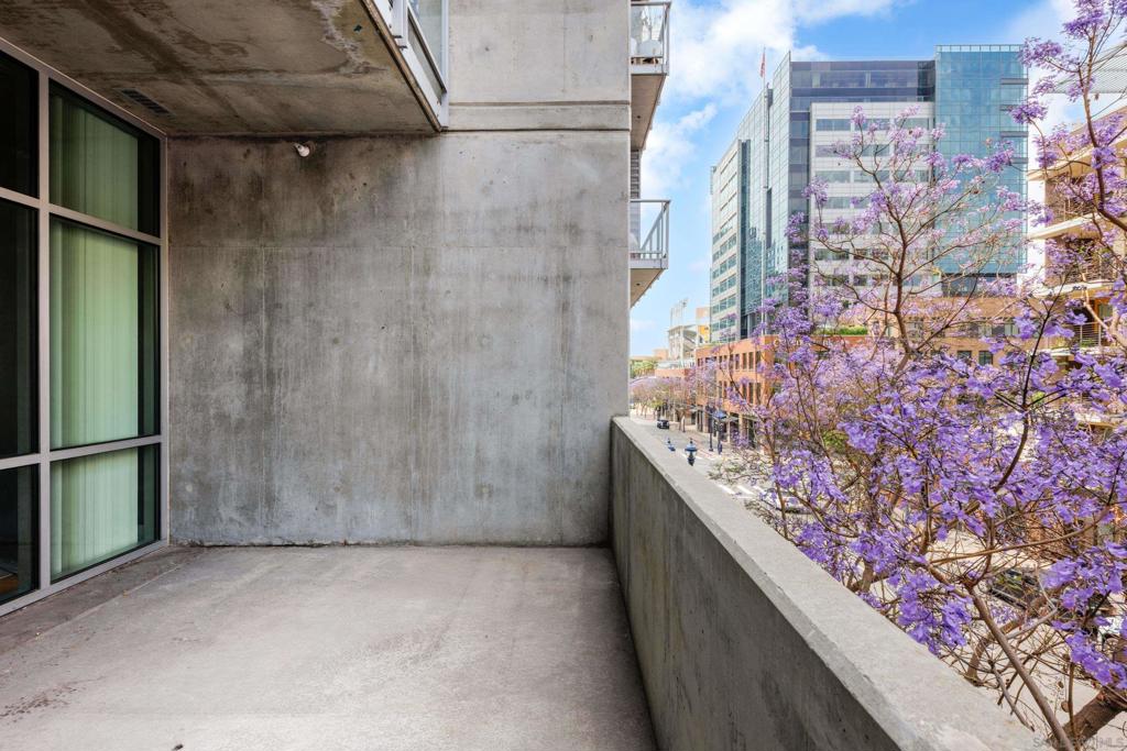 Discover refined urban living in this exceptional 2-bedroom, 2-bath residence at the iconic Fahrenheit building in San Diego's vibrant East Village. Thoughtfully designed with soaring concrete ceilings, exposed ductwork, and floor-to-ceiling windows, this 1,028 sq ft loft-style home is a sophisticated blend of industrial edge and modern elegance. The open-concept layout extends seamlessly to a rare, expansive private patio, an entertainer's dream and a true extension of the living space. The streamlined kitchen, anchored by a central island, offers both style and practicality. Additional highlights include in-unit laundry, central air, and a dedicated parking space within a secure, boutique building. Just steps from Petco Park, the Gaslamp Quarter, and some of the city's finest dining, this residence delivers a premier downtown lifestyle.