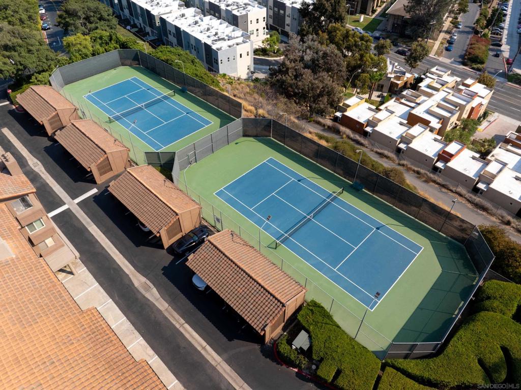 Welcome to this beautifully maintained corner unit in the heart of Mission Valley, offering comfort, privacy, and resort-style living. Being a corner unit, you share only one wall with neighbors, creating a more peaceful environment. The spacious interior features hardwood flooring in the living room and kitchen, a smartly designed floor plan, and upgraded energy-efficient dual-pane windows, A newer AC system, a significant upgrade that typically requires a crane to replace.Two private balconies overlook abundant greenery offering serene spots to enjoy your morning coffee or evening unwind. This first-floor unit has convenient elevator access and is move-in ready. Laundry facilities are nearby, with hookups available should you prefer your own in-unit system. The home includes two parking spaces one covered and one uncovered adding to its everyday convenience. Community amenities are extensive: a sparkling pool, relaxing sauna, fitness center, tennis courts, dog park area, racquetball courts, and lush landscaped grounds.The location offers unbeatable convenience: just minutes from shopping, dining, Snapdragon Stadium, & SDSU