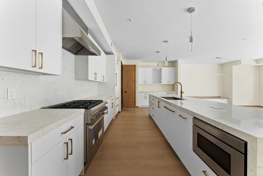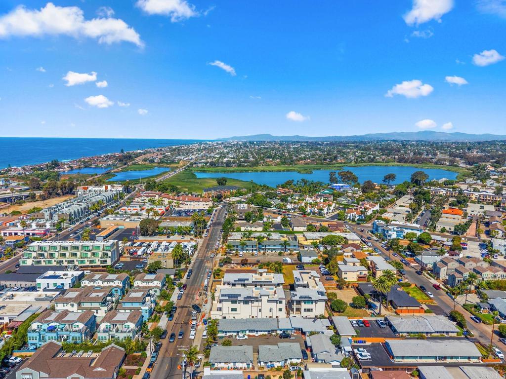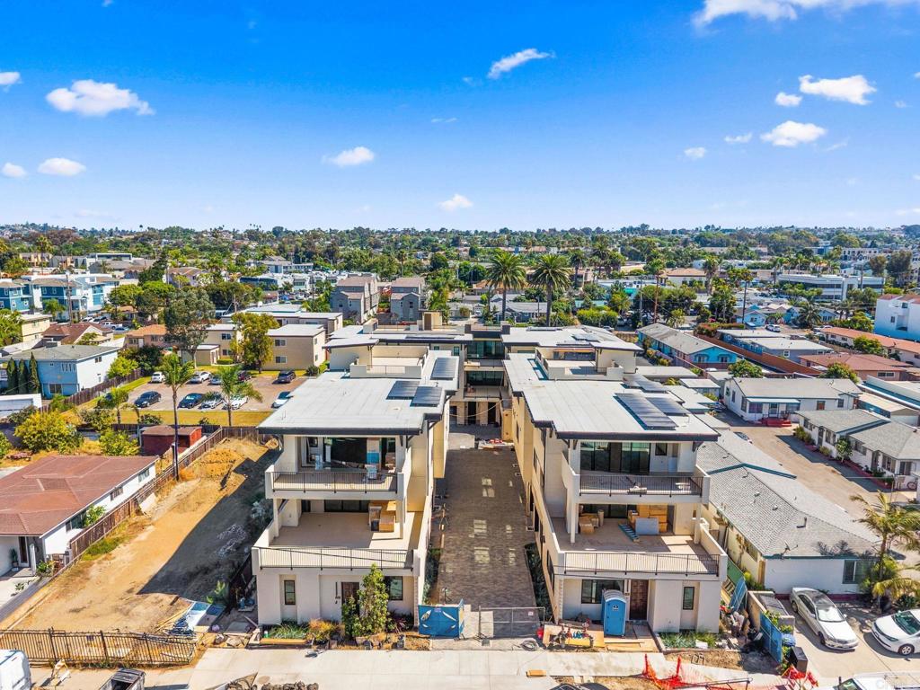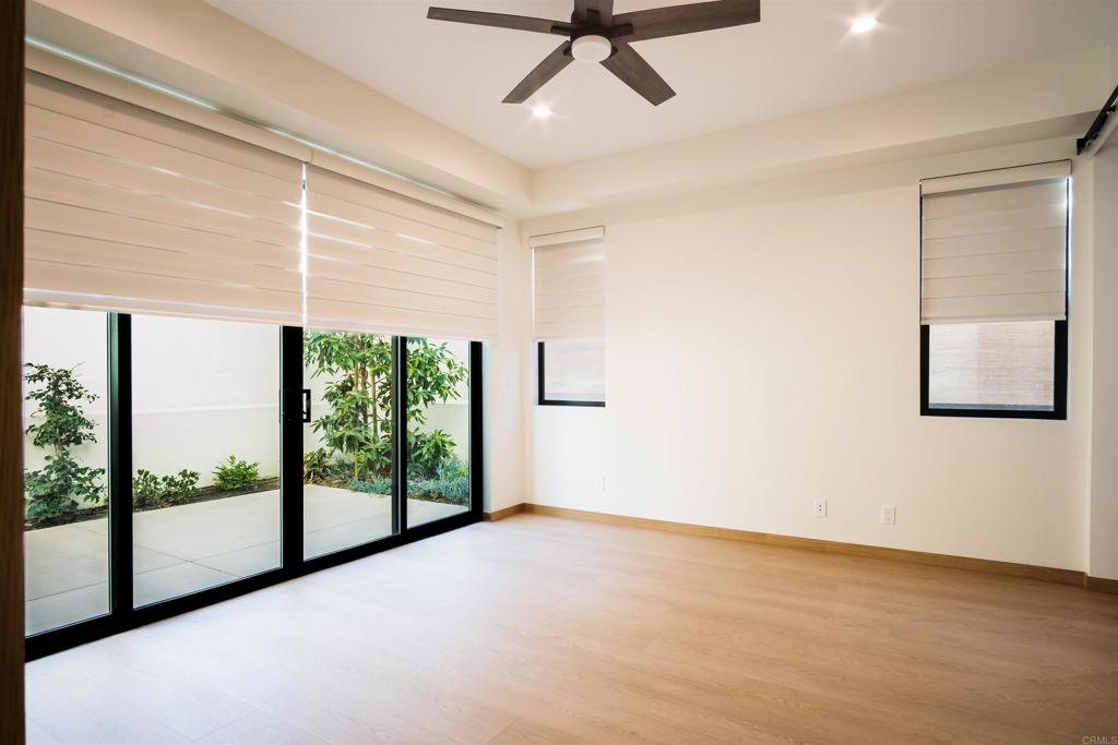 NEW CONSTRUCTION - Beautiful single-level (no stairs), first-floor unit at Roosevelt Nine Condos. Home features an open-concept true chef's kitchen showcasing an oversized island, white custom European slab-style cabinets, Thermador appliances (fridge and dishwasher paneled to match), gold hardware, a Kohler touchless faucet, and a professional-grade Thermador hood vent. Corian Quartz counters, matching backsplash, and a dramatic waterfall island create a modern, high-end look. Dining area includes a large custom built-in seating bench with extra storage. Solid core doors from Urban Doors and matching wood baseboards run throughout, complemented by luxury motorized window treatments in bedrooms. Spacious primary suite offers a large sliding glass door opening to the private backyard and filling the room with natural light. Attached primary bathroom features designer tile, a custom glass shower enclosure, and a fully built-out walk-in closet. Located in the heart of Carlsbad Village, this home is a short stroll to countless dining options ranging from Michelin-rated restaurants like Jeune et Jolie and Lilo to casual favorites like Pure Taco and everything in between. The large, side-by-side attached garage (424 sf) will include epoxy flooring and custom storage cabinets, along with an EV outlet for car charging. Comes with owned solar. Unit is complete and power / gas are on. This an incredible opportunity to move into a highly upgraded brand-new home in one of Carlsbad's most vibrant neighborhoods.