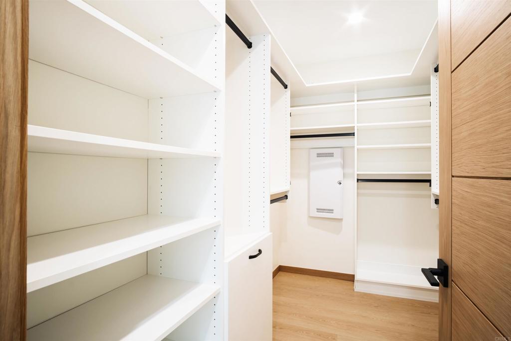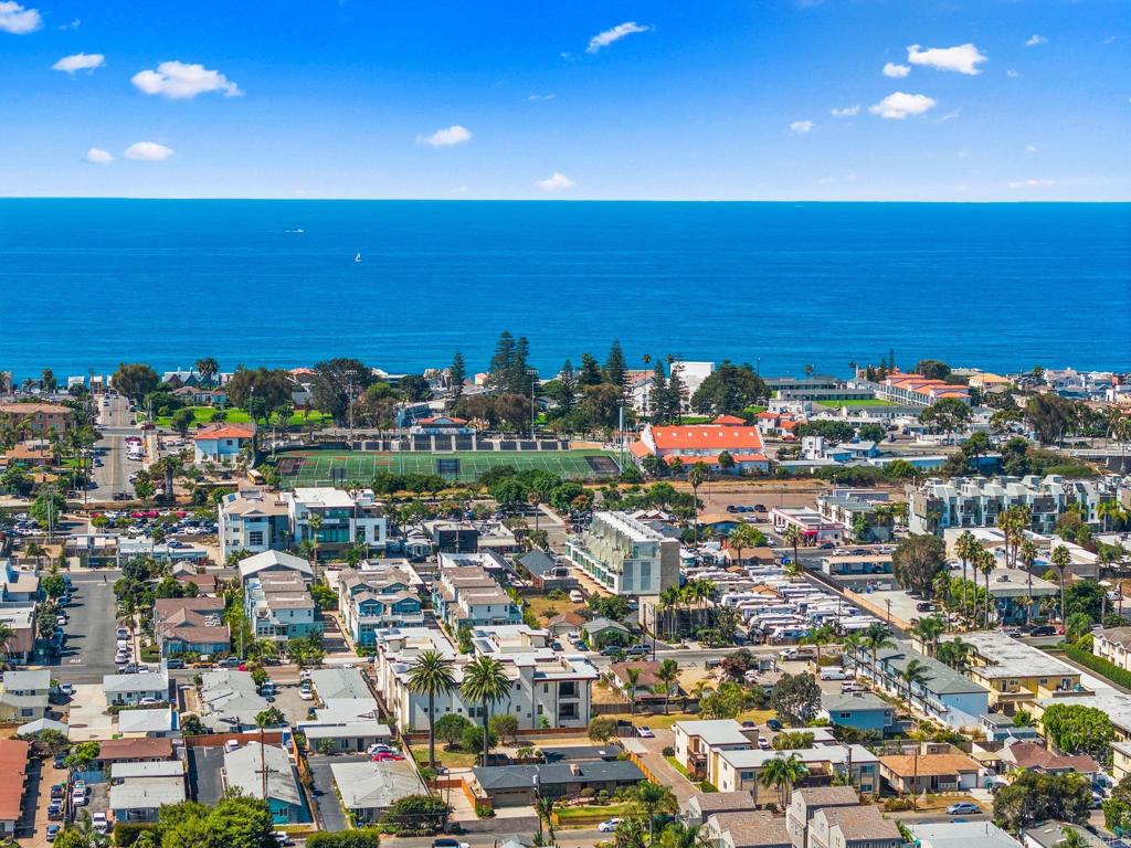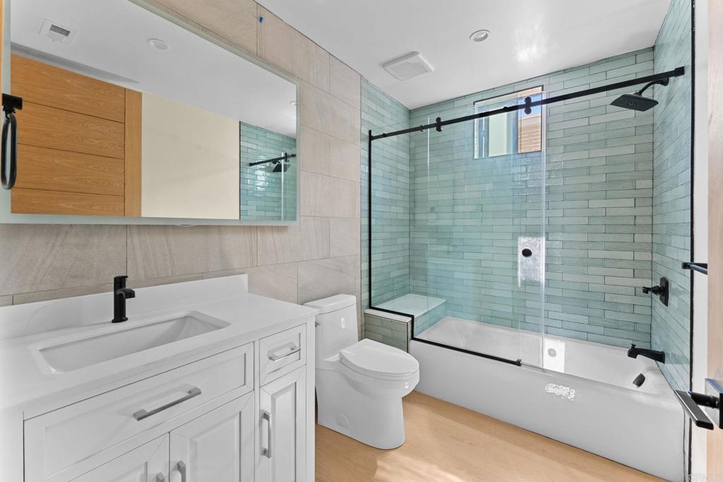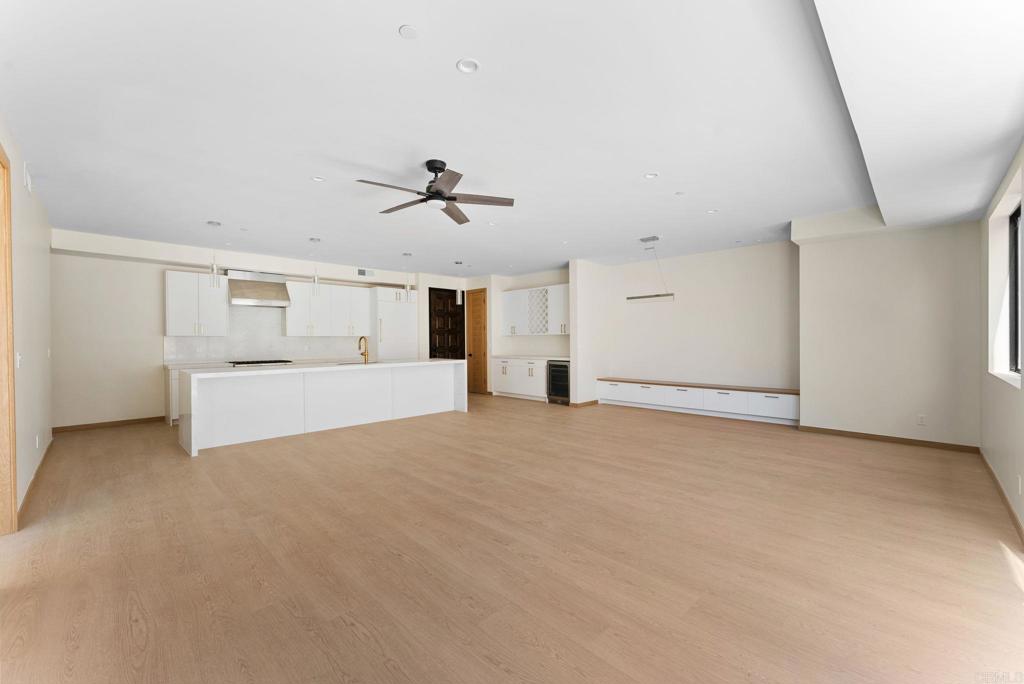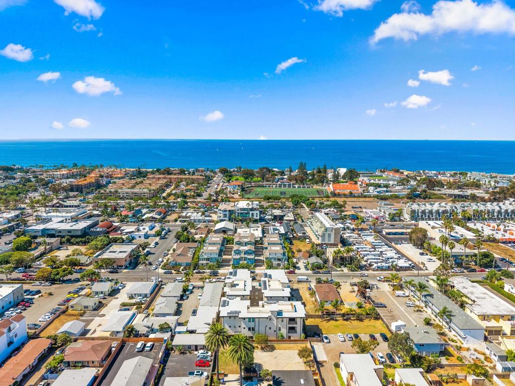 NEW CONSTRUCTION - Beautiful single-level (no stairs), first-floor unit at Roosevelt Nine Condos. Home features an open-concept true chef's kitchen showcasing an oversized island, white custom European slab-style cabinets, Thermador appliances (fridge and dishwasher paneled to match), gold hardware, a Kohler touchless faucet, and a professional-grade Thermador hood vent. Corian Quartz counters, matching backsplash, and a dramatic waterfall island create a modern, high-end look. Dining area includes a large custom built-in seating bench with extra storage. Solid core doors from Urban Doors and matching wood baseboards run throughout, complemented by luxury motorized window treatments in bedrooms. Spacious primary suite offers a large sliding glass door opening to the private backyard and filling the room with natural light. Attached primary bathroom features designer tile, a custom glass shower enclosure, and a fully built-out walk-in closet. Located in the heart of Carlsbad Village, this home is a short stroll to countless dining options ranging from Michelin-rated restaurants like Jeune et Jolie and Lilo to casual favorites like Pure Taco and everything in between. The large, side-by-side attached garage (424 sf) will include epoxy flooring and custom storage cabinets, along with an EV outlet for car charging. Comes with owned solar. Unit is complete and power / gas are on. This an incredible opportunity to move into a highly upgraded brand-new home in one of Carlsbad's most vibrant neighborhoods.