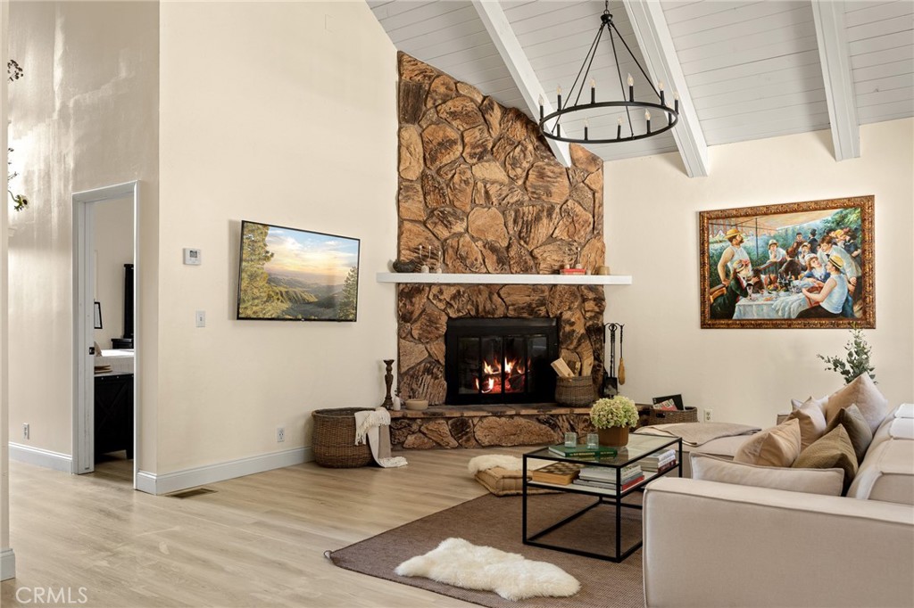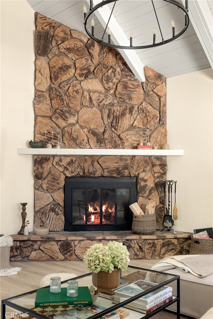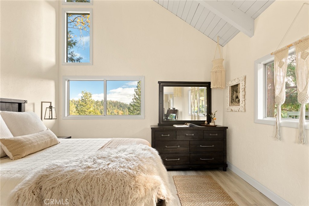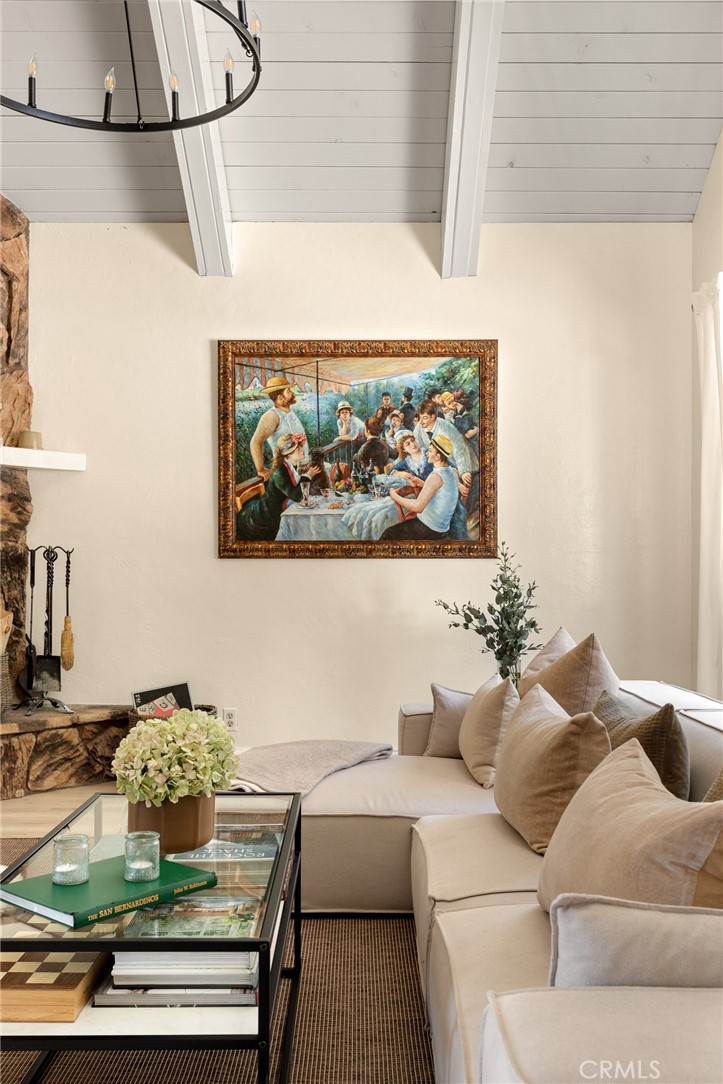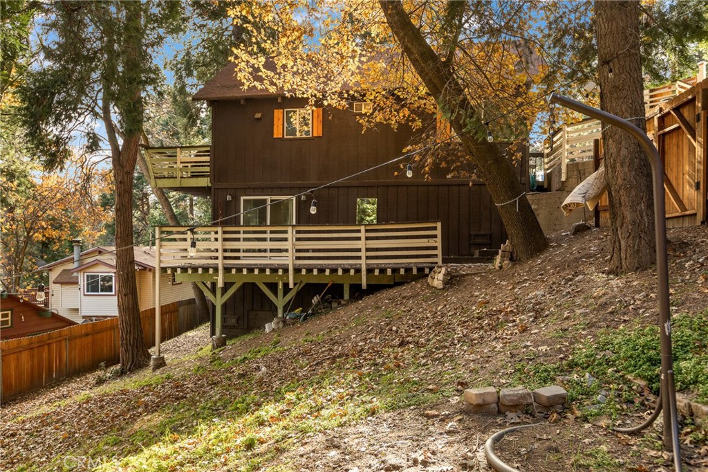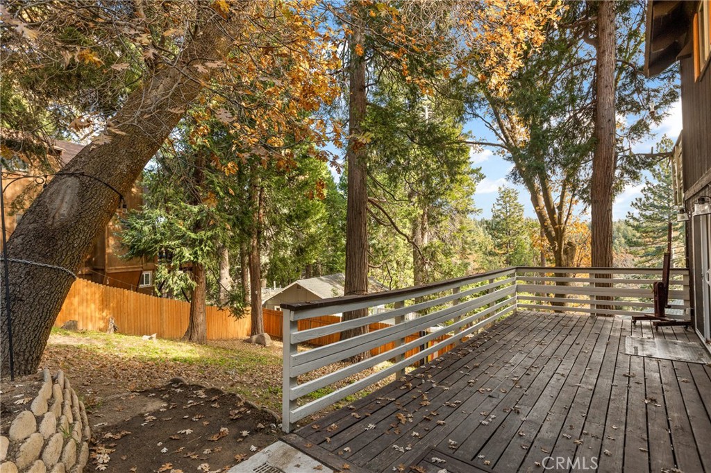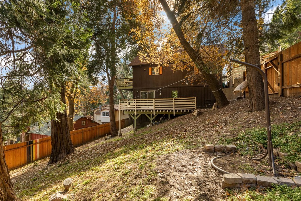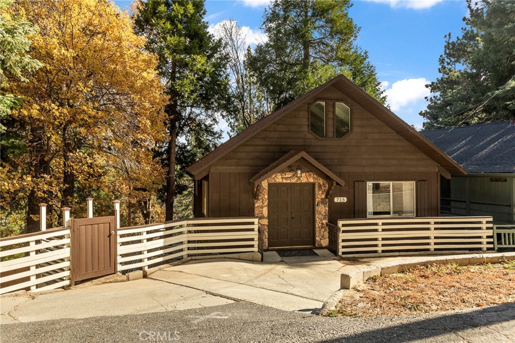 A mid-century chalet with soaring ceilings and a perfectly framed view of never ending tree tops. Spend your time in the mountains at this light-filled and serene cabin. A main floor living space with sky high ceilings and centerpiece stone fireplace is the heart of the home. Adjacent you will find a bright bedroom and kitchen with private deck. The downstairs bonus room is a perfect retreat with charming accents and french doors leading to a 2nd cozy bedroom and bath. The most unique aspect of the property is the fully fenced and usable large yard with access from the downstairs bonus room! Located central to Sky Park at Santa's Village, the shops and restaurants at Sky Forest and The Village at Lake Arrowhead. This is a walk in a drop your bags type of home!